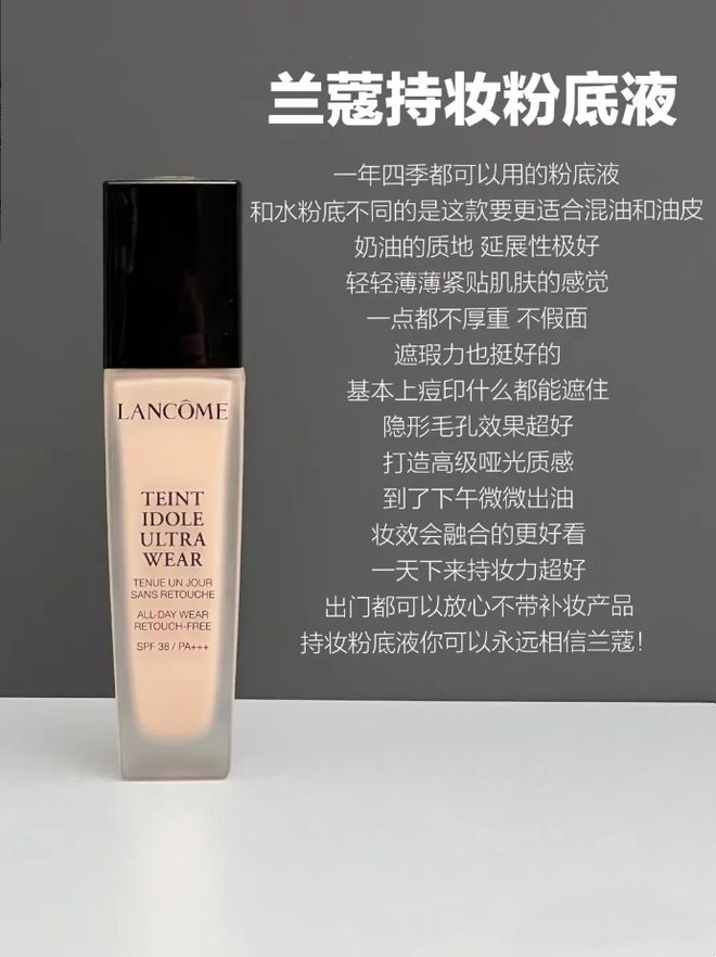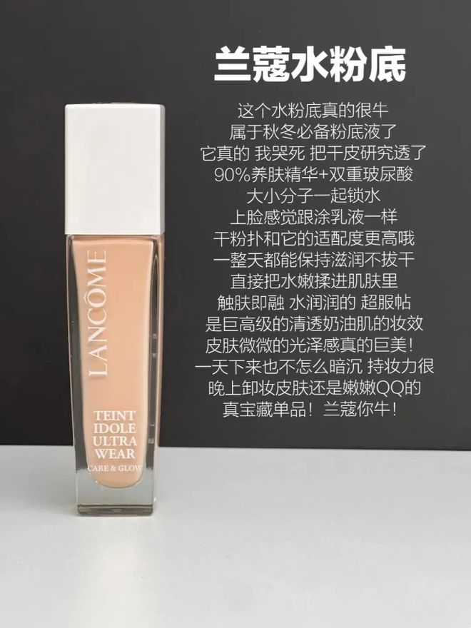 包装很有质感,流动性很强,非常水润有光泽,不会厚重,遮瑕万也很可以,脸上的小瑕疵基本上都能遮住,兰蔻刚出的新品,最近疯狂迷爱上的,润得就和乳液一样,而且超级融肤,徒手上妆都很匀称服帖。