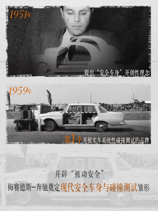 用奔驰官方说法是,1951 年,「汽车安全之父」贝拉·巴恩伊开创性发明带缓冲溃缩区的刚性乘员舱,定义了现代安全车身的雏形。