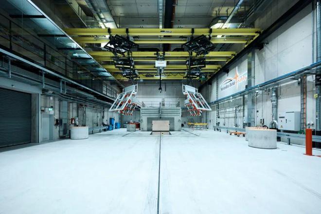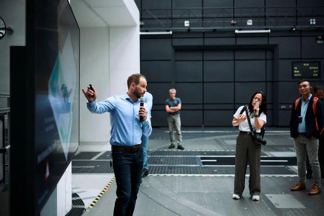 这个巨大的混凝土建筑,是奔驰全球三个自有多功能风洞中的一个(中国目前用于汽车制造的各式风洞总共有 10 个人左右),内部空气温度能恒定控制在 23 到 24 度之间。