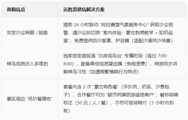 远胜游解决方案:实时同步 “额济纳胡杨林景区运营中心” 冬季开放清单,如黑城遗址关闭则替换为 “东风航天城观光”(含专业讲解航天发射历史),确保行程时长、体验项目不减少,避免因景点关闭导致行程空缺。
