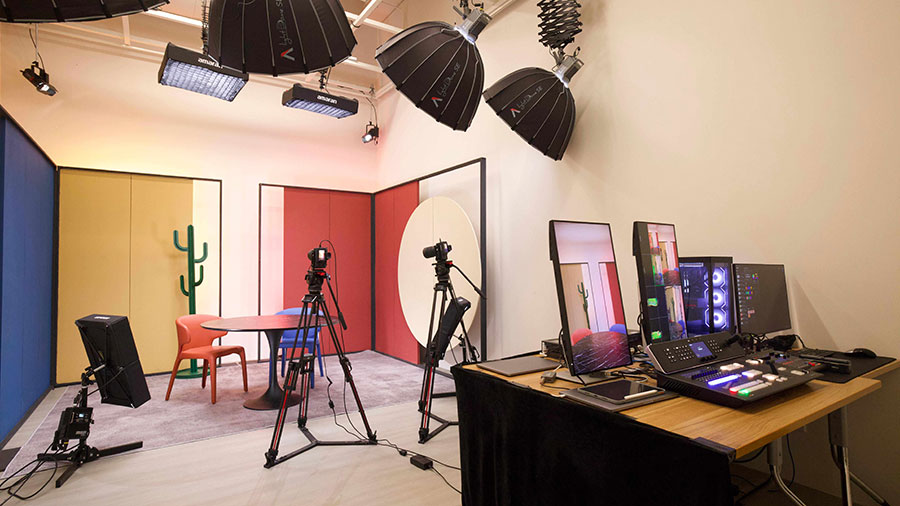 场景设计:选用品牌色系的轻量化材质,采用吊顶方钢提升空间利用率,同步优化声学环境,打造专业影棚质感;