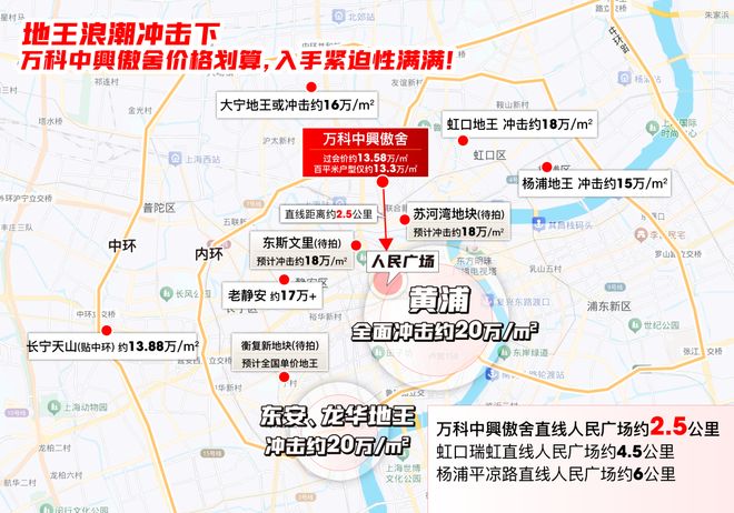 新房层面,黄浦、徐汇冲击约20万/㎡,老静安约17万+/㎡,虹口大概率约16-18万/㎡,中興傲舍比周边新房便宜约3-4万/㎡,即约百平米差约300-400万!