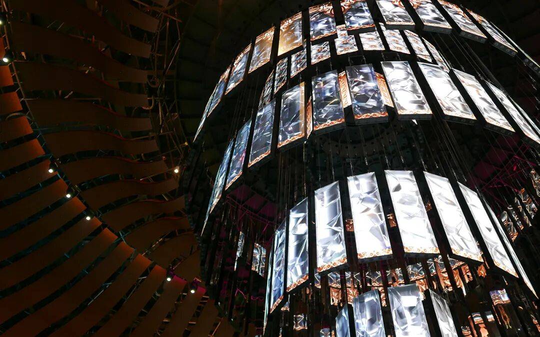 而与极光道相连的环形大堂和极光立方,则是另一种视觉奇观。大堂中央的数字吊灯由150余块LED面板拼接而成,每隔几分钟变换一次图案,从银河星云到节日烟火,流转之间极具震撼力。对于初次到访的人来说,这就是迎仕柏给出的第一重礼遇:让假期从一场视觉盛宴开始。
