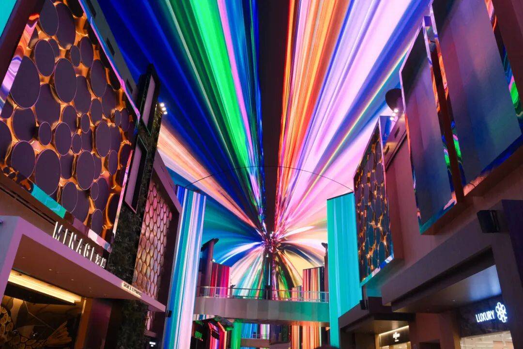 度假城的标志性空间“极光道”,全长150米,挑高25米,巨大的LED穹顶以三百六十度的光影效果将旅客包裹其中。在这里,“非洲大草原”的辽阔与“宇宙奥德赛(Cosmic Odyssey)”的深邃交替呈现,引领我们穿梭于虚实之间:无尽的银河在头顶闪烁,转眼间非洲草原的图景正缓缓展开……每一帧画面,都是一次对感官的焕新。